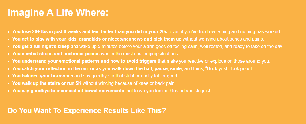 The Restore Your Health Metabolic Reset Program is designed for busy people who “have tried it all” and are ready to permanently lose excess weight, gain youthful energy, and have more clarity and confidence than ever before.